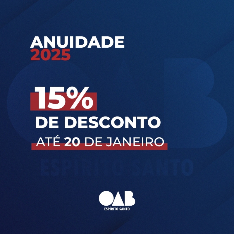 Em seu primeiro ato como presidente da OAB-ES, Érica Neves assinou a portaria que prorroga até o dia 20 de janeiro o prazo para o desconto de 15% incidente na parcela única da anuidade referente ao ano de 2025.