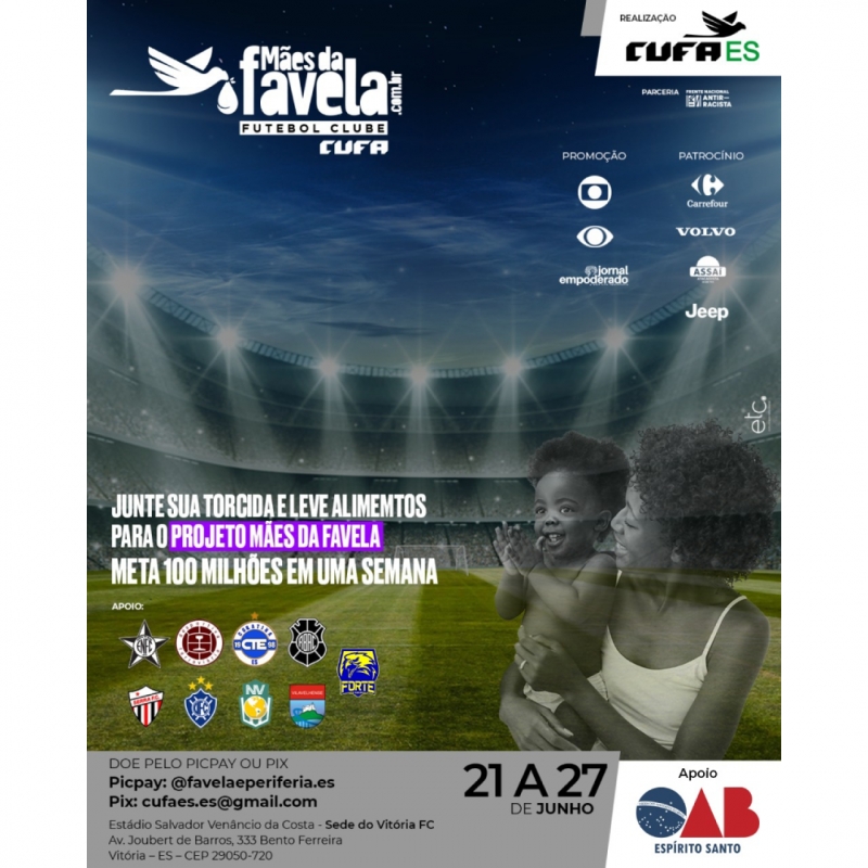A OAB-ES está apoiando a campanha nacional da Central Única das Favelas (Cufa), que decidiu unir forças com a Comunidade Door, a Frente Nacional Antirracista e clubes de futebol por todo o país e lançar a campanha Mães da Favela Futebol Clube.