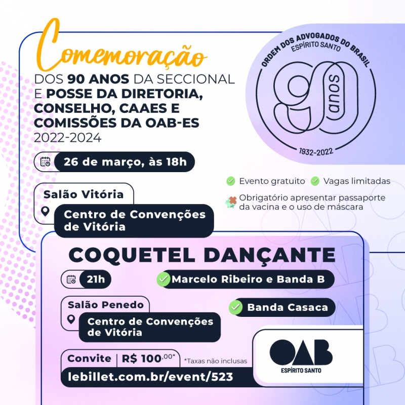 No próximo dia 26 de março, às 18 horas, será realizado no Centro de Convenções de Vitória, a partir das 18 horas, a comemoração dos 90 anos da Ordem dos Advogados do Brasil, Seccional Espírito Santo (OAB-ES), a posse da Diretoria, dos Conselheiros Estaduais e Federais e das Comissões 2022-2024. O evento, gratuito, será realizado no Centro de Convenções de Vitória, no Salão Vitória. As vagas são limitadas e é obrigatório apresentar o passaporte da vacina e o uso de máscara.