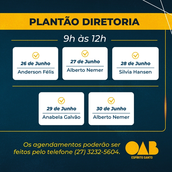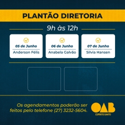 A OAB-ES acaba de divulgar os horários do plantão da sua Diretoria para atendimento exclusivo para a advocacia capixaba neste mês de junho.