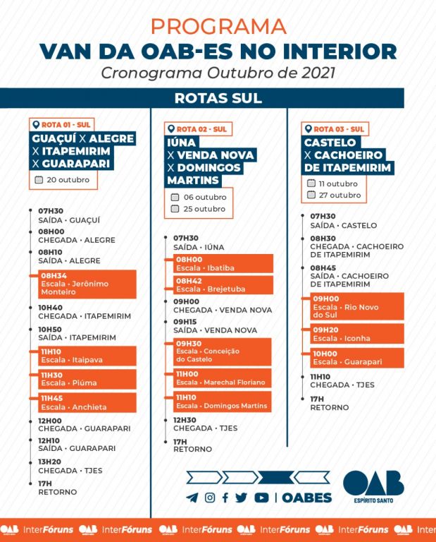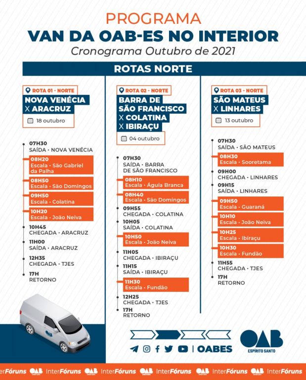 OAB-ES divulga horários e itinerários do serviço de vans para o Norte e Sul para o mês de outubro