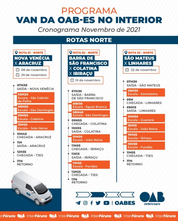 Os advogados e advogadas do Norte e Sul do Estado que utilizam o serviço de vans para a Capital devem ficar atentos. A OAB-ES divulgou as novas datas, horários e itinerários, abrangendo diversos municípios, com saídas das Subseções e escalas para o mês de novembro.