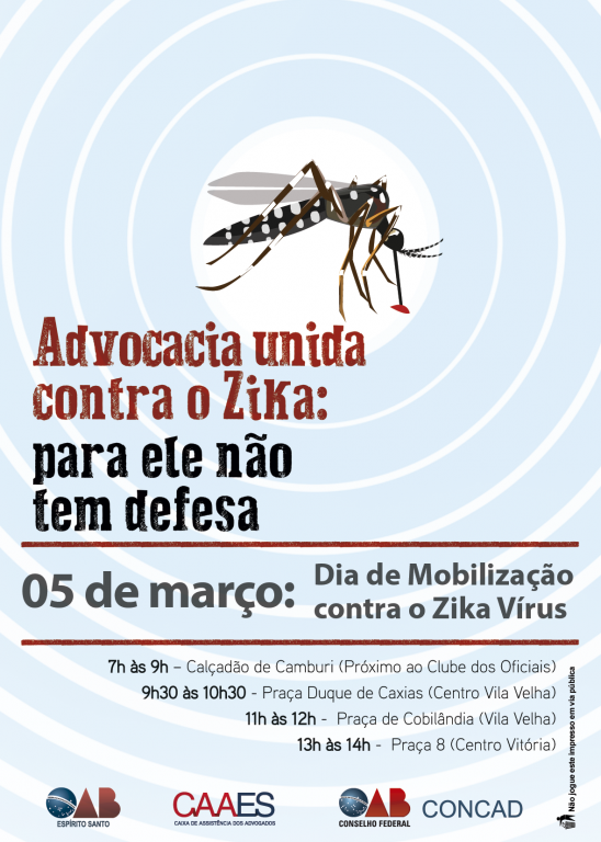 A Ordem dos Advogados do Brasil – Seção Espírito Santo (OAB-ES) e a Caixa de Assistência dos Advogados vão realizar uma ação de conscientização nas ruas da Grande Vitória para mobilizar a população no combate ao mosquito Aedes Aegypti transmissor do Zika Vírus. O evento será neste sábado, a partir das 7h, em Vitória e Vila Velha.