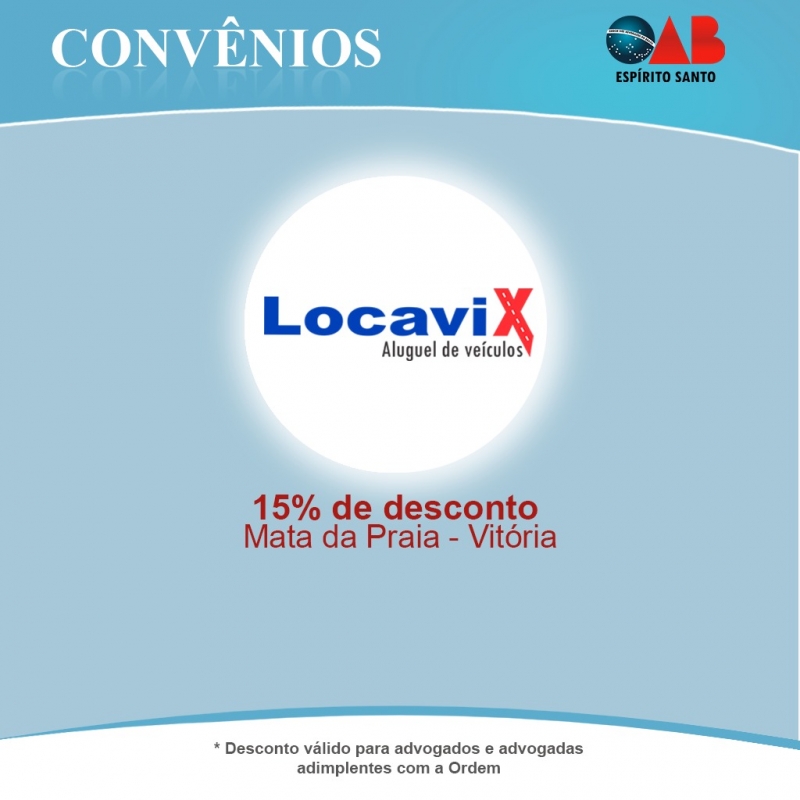 A Ordem dos Advogados do Brasil - Seção Espírito Santo (OAB-ES) fechou convênio com a Locavix Aluguel de Veículos, uma empresa 100% capixaba, voltada para os serviços de aluguel de veículos diários e mensais, terceirização de frota, transfers, atendimento a eventos, encomendas expressas e passeios turísticos privativos. Os advogados inscritos na OAB-ES terão descontos de 15% no valor da tabela de diárias de locação de veículos. O desconto não incide sobre as proteções, taxas e valores de diárias promocionais.