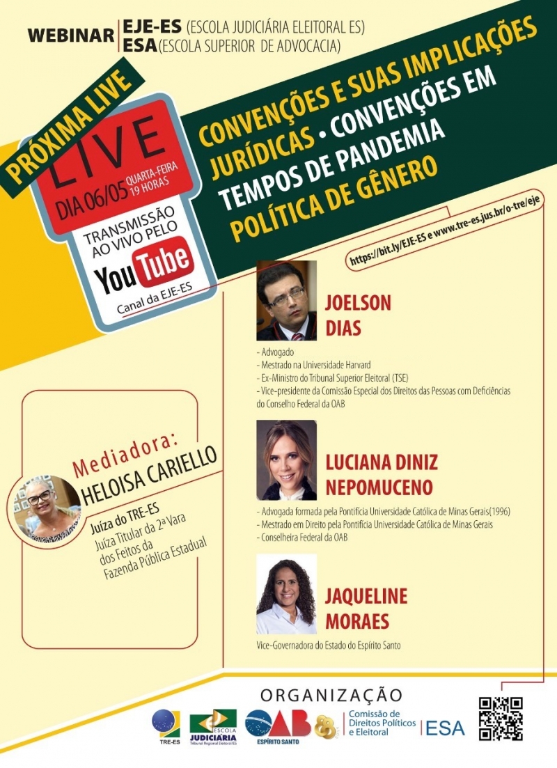 A transmissão do debate será ao vivo, às 19h, no canal da EJE-ES na plataforma Youtube. Os interessados podem acompanhar pelos links https://bit.ly/EJE-ES e www.tre-es.jus.br/o-tre/eje