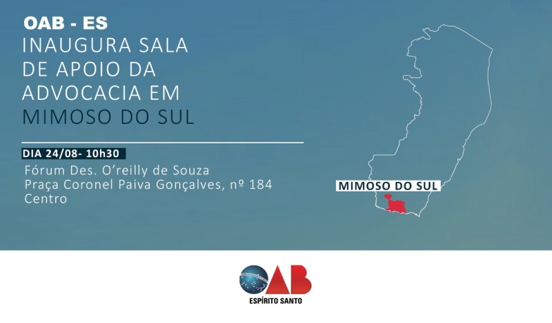 Dando continuidade ao seu projeto de interiorização, a Ordem dos Advogados do Brasil – Seccional Espírito Santo (OAB-ES) inaugura na próxima sexta-feira (24), às 10h30, a Sala de Apoio da Advocacia de Mimoso do Sul, no Sul do Estado.