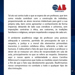 O ambiente acadêmico exige do professor uma postura adequada e coerente, partindo do pressuposto de que o respeito, a justiça e a moral são elementos primordiais inerentes à conduta cotidiana ética, referente a todo ser humano. É indiscutível o fato de que recai sobre o professor o dever de se instaurar um clima de reciprocidade em sala de aula, principalmente no que se refere ao respeito. Deixamos aqui o nosso apoio e solidariedade a aluna Carolina Bittencourt e esperamos que todas as medidas sejam tomadas a fim de que o fato seja devidamente apurado. Reafirmamos nosso compromisso no combate a todo e qualquer tipo de discriminação.