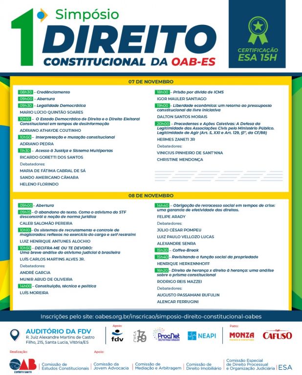 É gratuito e tem 15 horas de Certificação pela ESA. As inscrições podem ser feitas no link: http://oabes.org.br/inscricao/simposio-direito-constitucional-oabes