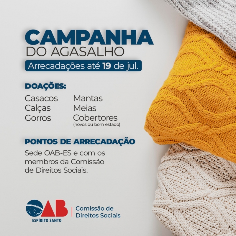 A OAB-ES, por meio da Comissão de Direitos Sociais, convida a advocacia e a sociedade capixaba a participar da 6ª edição da Campanha do Agasalho para aquecer quem mais precisa.