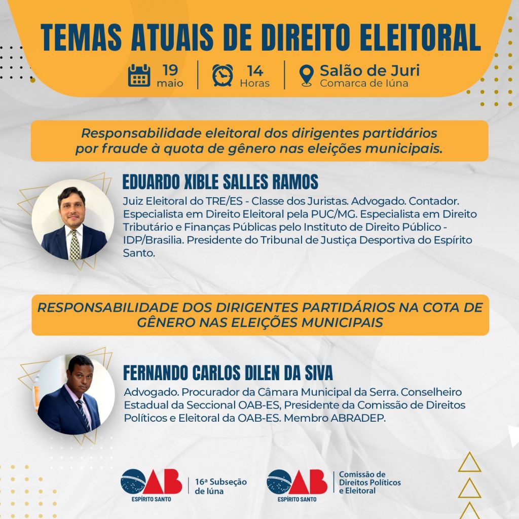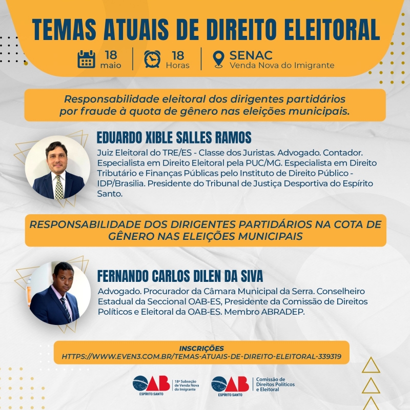 Nesta quinta-feira (18/05), o evento será realizado para a advocacia da 18ª Subseção de Venda Nova do Imigrante, às 18 horas, no Sesc da cidade. A primeira palestra com o tema “Responsabilidade eleitoral dos dirigentes partidários por fraude à quota de gênero nas eleições municipais” será apresentada pelo juiz eleitoral, Eduardo Xible Salles Ramos.