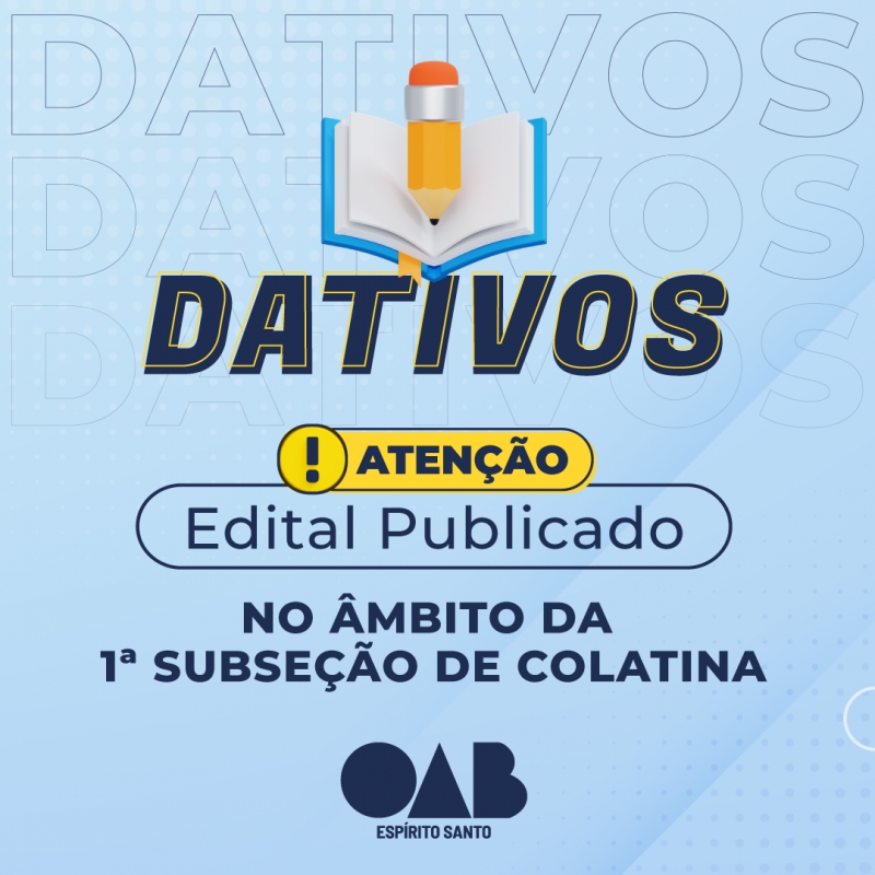 Nesta segunda-feira (06/06/2022), a Ordem dos Advogados do Brasil, Seccional Espírito Santo (OAB-ES) publicou o Edital de Inscrição Extraordinária para o exercício do múnus de dativos no âmbito da 1ª Subseção de Colatina, Comarca de Marilândia e São Domingos do Norte.