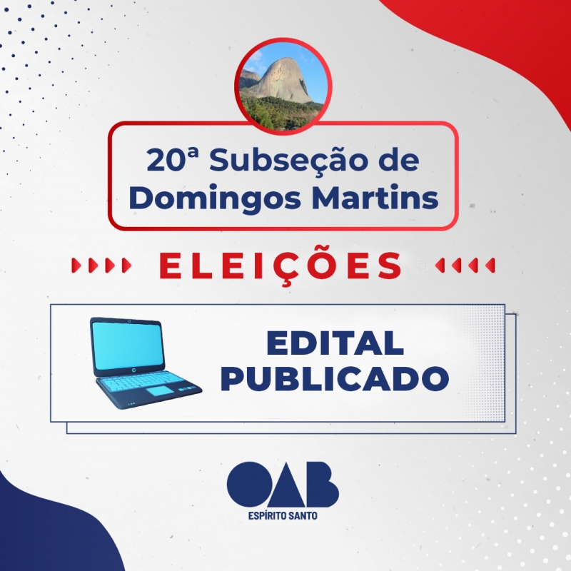 A Ordem dos Advogados do Brasil – Seccional Espírito Santo (OAB-ES) publicou, nesta segunda-feira (09/05/2022) o Edital para as eleições da nova 20ª Subseção de Domingos Martins, além do Requerimento de inscrição de chapas para o triênio 2022-2024.