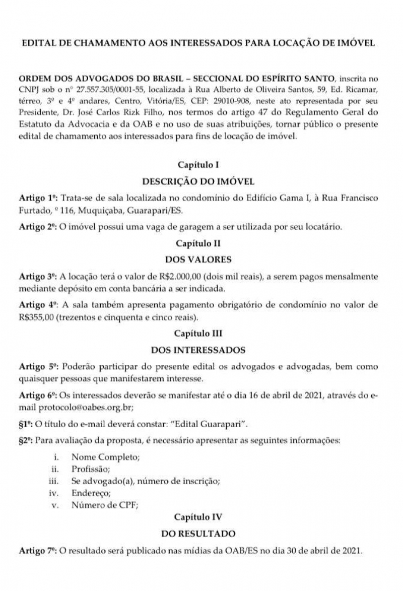 A Ordem dos Advogados do Brasil - Seccional Espírito Santo (OAB-ES), nos termos do artigo 47 do Regulamento Geral do Estatuto da Advocacia e da OAB e no uso de suas atribuições, torna público o Edital de chamamento aos interessados para fins de locação de imóvel.