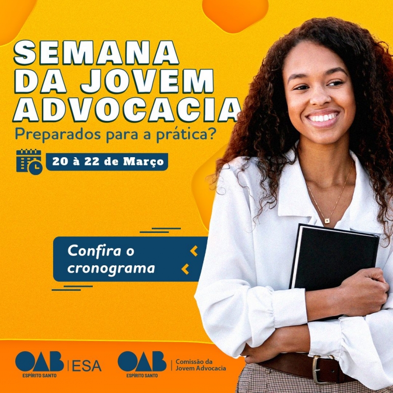 A Ordem dos Advogados do Brasil Seccional Espírito Santo (OAB-ES), através da Comissão da Jovem Advocacia (OAB Jovem - ES), estará realizando a Semana da Jovem Advocacia do dia 20 ao dia 22 de março, no Auditório da ESA-ES, com um cronograma voltado aos advogados em início de carreira.