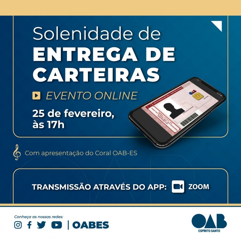 A OAB-ES realiza nesta quinta-feira (25/02) a primeira solenidade online para entrega de carteiras para bacharéis de diversas subseções do Estado e da Seccional.