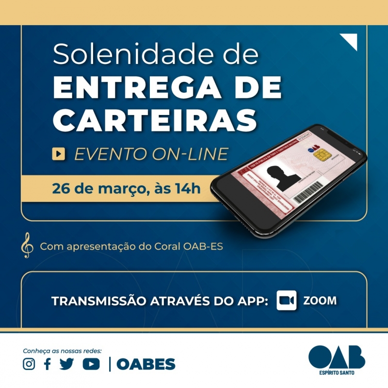 A OAB-ES realiza nesta sexta-feira (26/03) solenidade on-line para entrega de carteiras a bacharéis de diversas subseções do Estado e da Seccional.