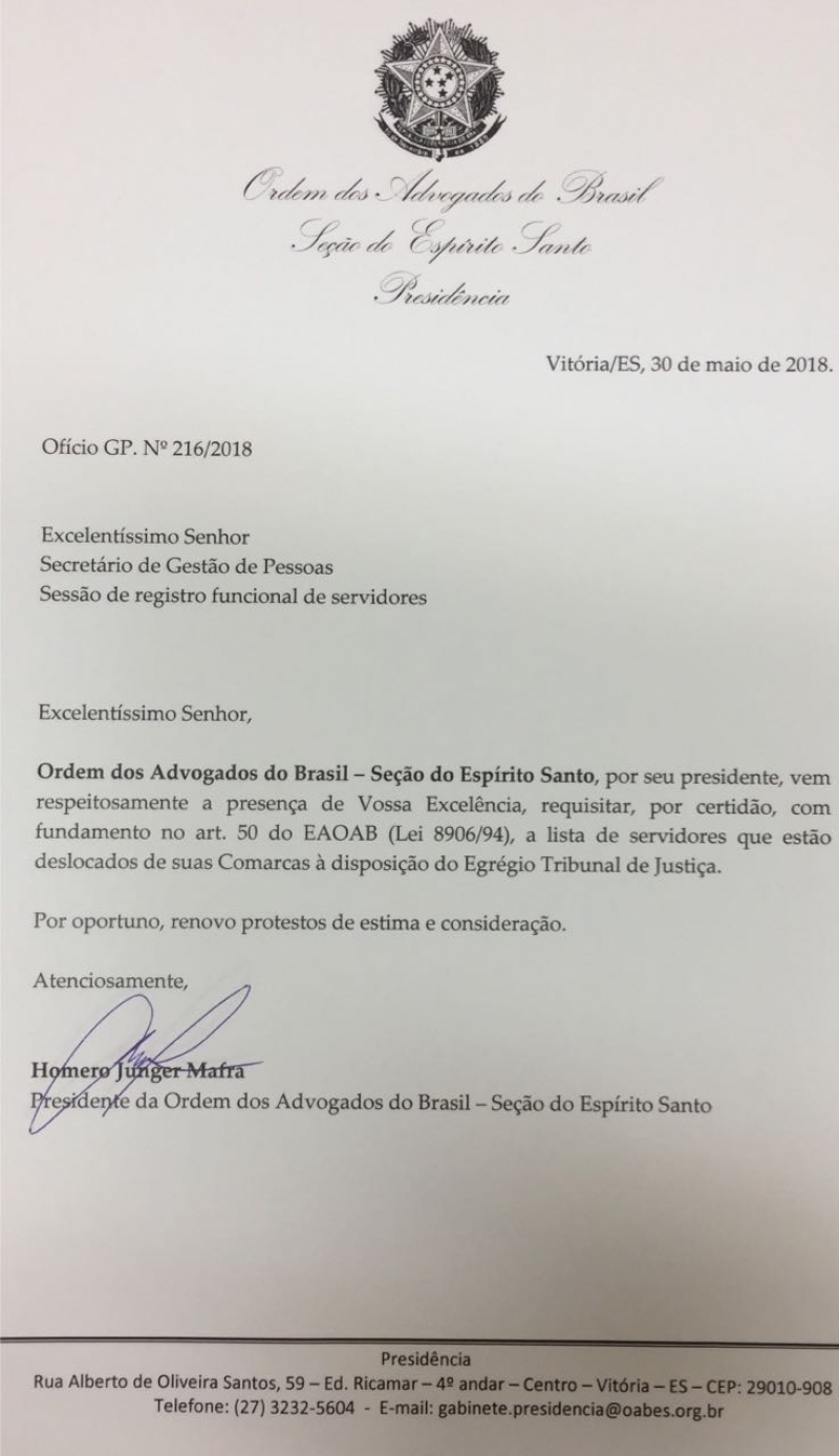 A Ordem dos Advogados do Brasil – Seção Espírito Santo (OAB-ES) enviou ofício ao Tribunal de Justiça do Espírito Santo (TJ-ES) solicitando a lista de servidores que estão deslocados de suas comarcas à disposição do Tribunal.
