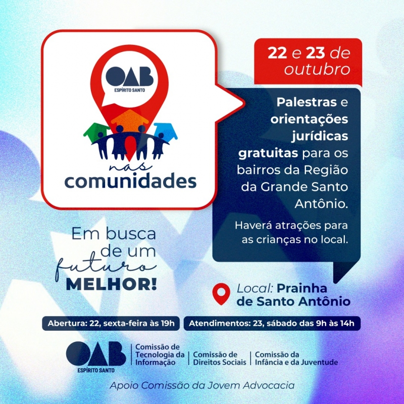 A OAB nas Comunidades, uma ação solidária das Comissões de Tecnologia da Informação, Direitos Sociais e Infância e Juventude, com apoio da Jovem Advocacia vai levar serviços assistenciais como palestras e orientação jurídica gratuita aos moradores das comunidades da Grande Vitória.