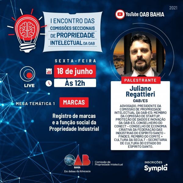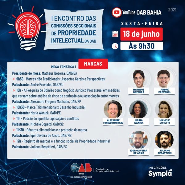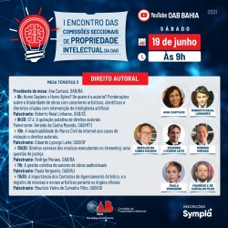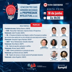 Nos próximos dias 18 e 19, das 9 às 17h, será realizado o I Encontro das Comissões Seccionais de Propriedade Intelectual da OAB. As inscrições são gratuitas e podem ser feitas pelo site do Sympla. O evento acontecerá pela plataforma Zoom e será transmitido ao vivo no canal da OAB-BA no YouTube. Serão fornecidos certificados de 16 horas-aula.