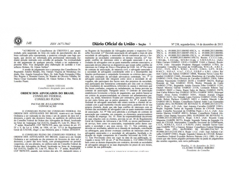 Essas são algumas das regras estabelecidas pelo Conselho Federal da Ordem dos Advogados do Brasil na regulação da figura do advogado associado, constante do Provimento 169, de 2 de dezembro, e publicado no Diário Oficial da União nesta segunda-feira (14/12).
