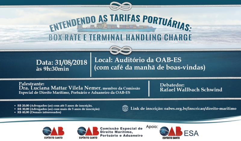 Palestra sobre tarifas portuárias acontece nesta sexta-feira (31) no auditório da OAB-ES