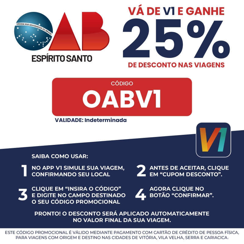 Mais conforto e comodidade aos participantes do I Congresso de Direito Condominial e Imobiliário que acontece nesta sexta-feira (26/04) no auditório do Hotel Comfort, na Praia do Canto, em Vitória. Quem for ao evento terá 25 % de desconto na viagem utilizando o código OABV1.