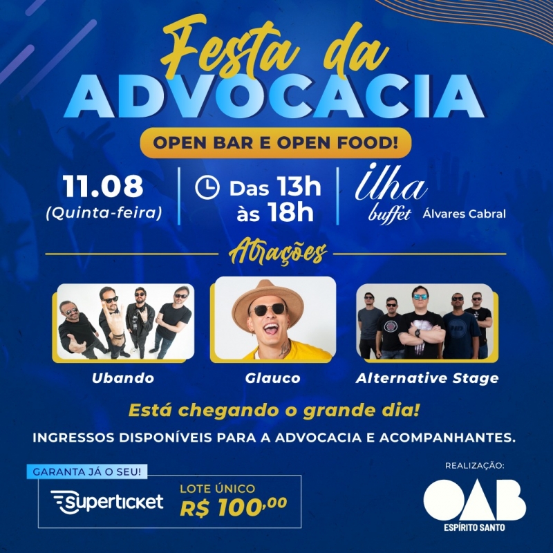 O evento será realizado no dia 11 de agosto, das 13h às 18h, no Ilha Buffet Álvares Cabral e contará com os artistas Glauco, Ubando, Alternative Stage e um DJ animando a confraternização. Além disso, o ingresso inclui open bar e open food. Advogados e advogadas também podem comprar ingressos para acompanhantes.