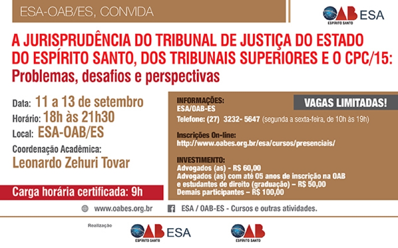 A Escola Superior de Advocacia da Ordem dos Advogados do Brasil, Seção Espírito Santo (ESA-OAB/ES) convida para o curso “A Jurisprudência do Tribunal de Justiça do Estado do Espírito Santo, dos Tribunais Superiores e o CPC/15: problemas, desafios e perspectivas”. Acontece de 11 a 13 de setembro, das 18h às 21h30, sob a coordenação acadêmica de Leonardo Zehuri Tovar, no auditório da ESA.