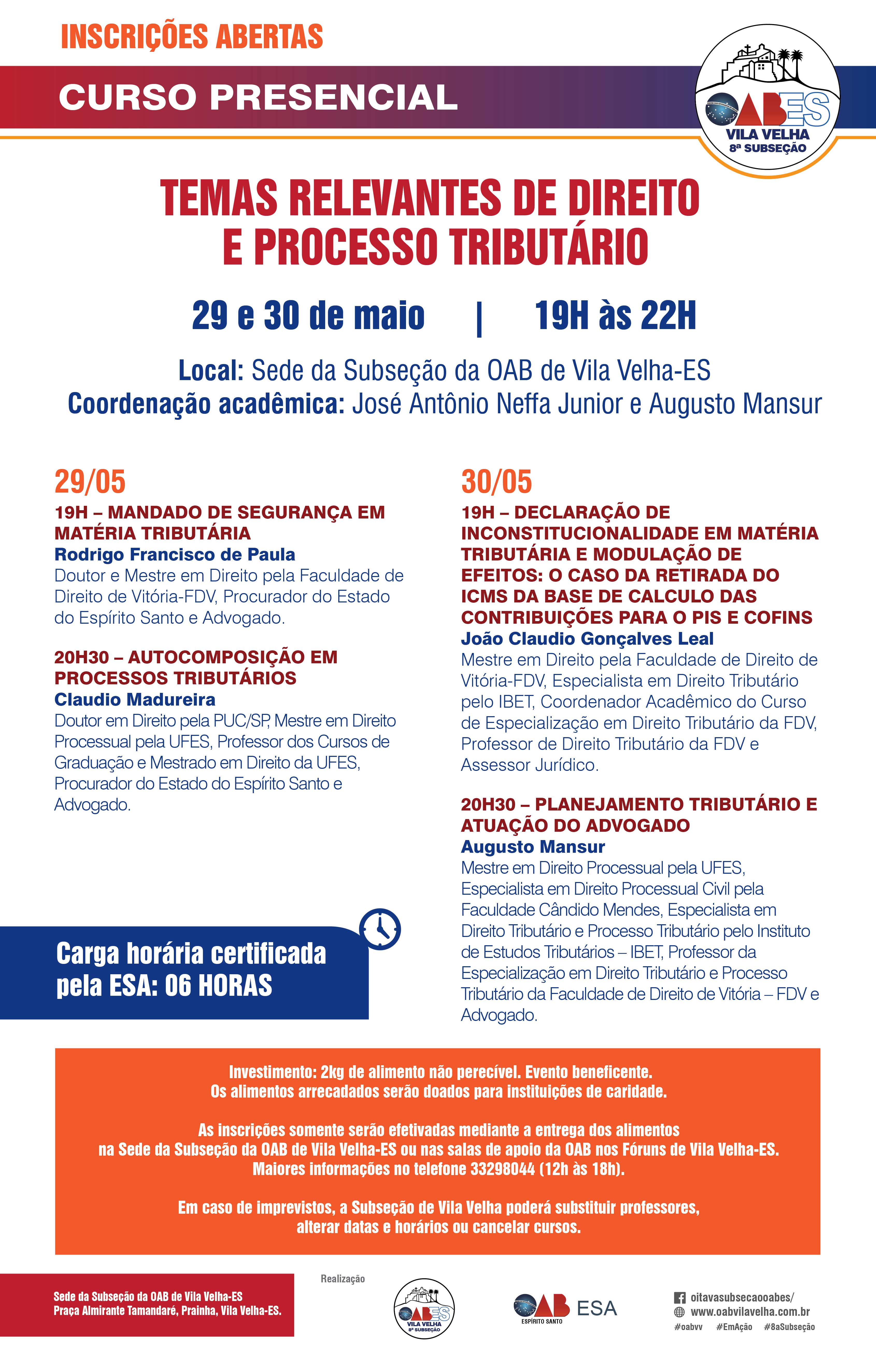 Já o curso “Temas Relevantes de Direito e Processo Tributário” acontece na Subseção de Vila Velha entre os dias 29 e 30 de maio e conta com coordenação de José Antônio Neffa Junior e Augusto Mansur. A carga horária certificada é de 06 horas e o investimento necessário é de dois quilos de alimentos não perecíveis. Veja mais.