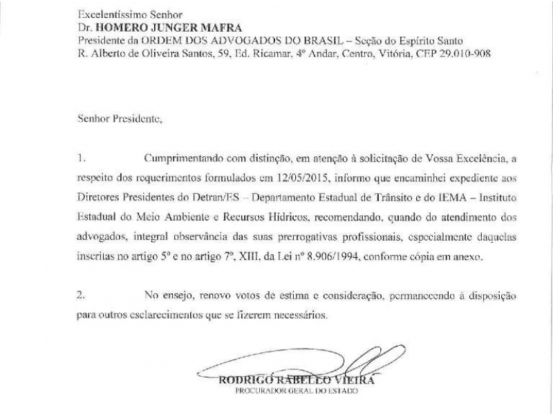 Atendendo requerimento apresentado pela Ordem dos Advogados do Brasil – Seção Espírito Santo (OAB-ES), a Procuradoria Geral do Estado (PGE) recomendou às Presidências do Departamento Estadual de Trânsito (Detran) e do Instituto Estadual do Meio Ambiente e Recursos Hídricos (IEMA) que observem as prerrogativas garantidas pelo Estatuto da Advocacia.