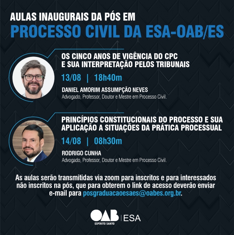 As aulas serão transmitidas, via ambiente ZOOM. Para obter o link de acesso, é preciso enviar e-mail para posgraduacaoesaes@oabes.org.br .