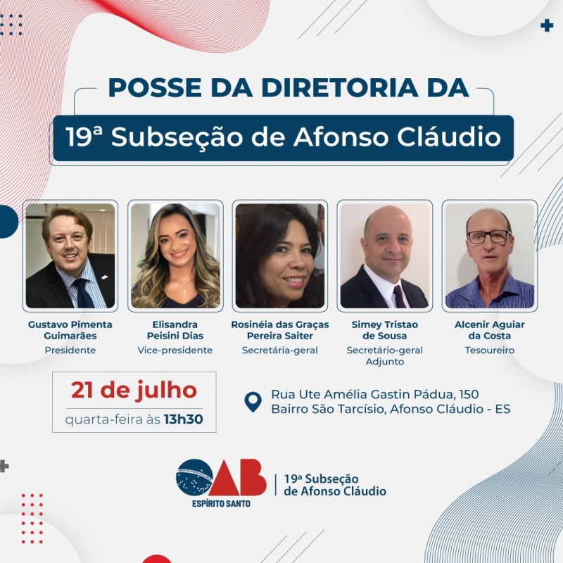 Posse da 1ª Diretoria da nova 19ª Subseção de Afonso Cláudio acontece na próxima quarta-feira (21/07)