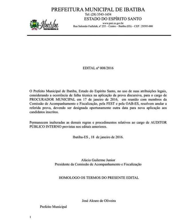 A Prefeitura de Ibatiba divulgou um comunicado informando que em razão da impropriedade ocorrida na prova discursiva para o cargo de PROCURADOR MUNICIPAL, aplicada no dia 17 de janeiro, após se reunir com representantes da OAB-ES, da Comissão de Acompanhamento e Fiscalização da Prefeitura Municipal de Ibatiba e a Fundação Espirito Santense, decidiu pela anulação da referida prova e designação de nova data para aplicação de novo exame aos candidatos inscritos, conforme consta no Edital 008/2016.