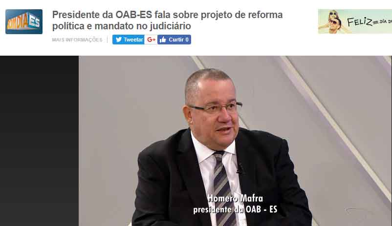 O presidente da OAB-ES, Homero Mafra, concedeu entrevista ao jornal Bom Dia ES, da TV Gazeta, sobre o ponto da Reforma Política, em discussão da Câmara dos Deputados que pretende criar mandatos de 10 anos para ministros do STF, STJ e TCU. O presidente da Ordem é a favor da medida. Veja na íntegra: