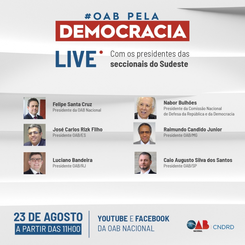 Participarão da live o presidente da OAB Nacional, Felipe Santa Cruz; o presidente da OAB-ES, José Caros Rizk Filho; a presidente da OAB-RJ, Luciana Bandeira; o presidente da OAB-MG, Raimundo Cândido Junior; o presidente da OAB-SP, Caio Augusto Silva dos Santos e o presidente da Comissão Nacional de Defesa da República e da Democracia, Nabor Bulhões.