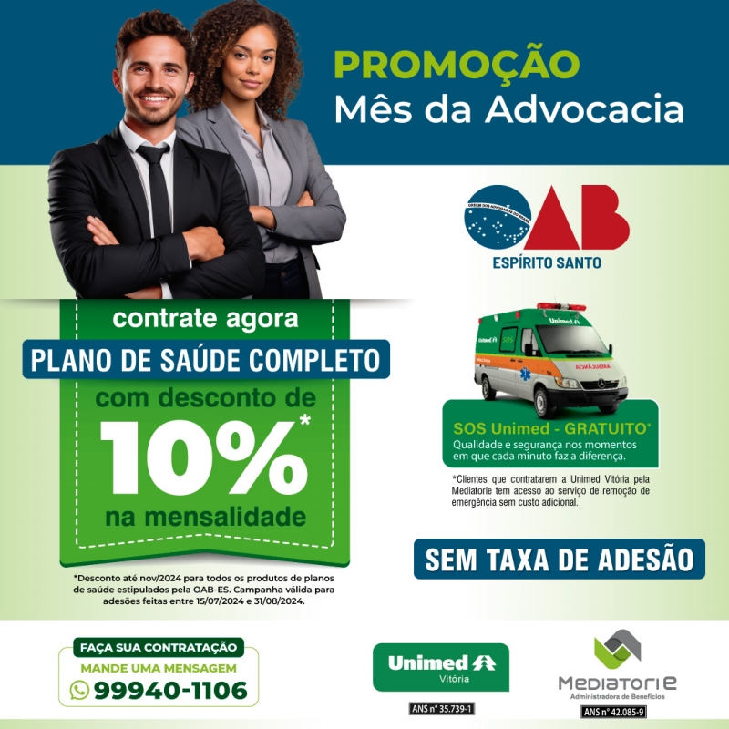 Em comemoração ao Mês do Advogado, a OAB-ES, em parceria com a Mediatorie Administradora de Benefícios, está lançando uma promoção especial para os profissionais da advocacia. De 15 de julho a 31 de agosto de 2024, todos os advogados poderão aderir aos planos de saúde da Unimed Vitória com um desconto exclusivo de 10% nas mensalidades.