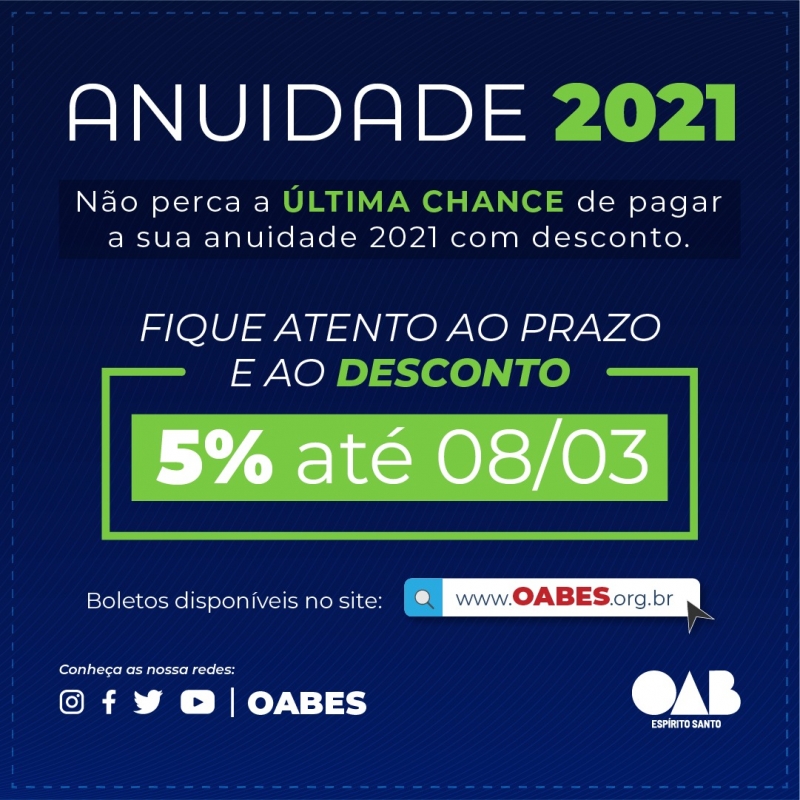 A próxima segunda-feira (08/03) é o último dia para obter o desconto de 5% em parcela única na anuidade da OAB-ES.