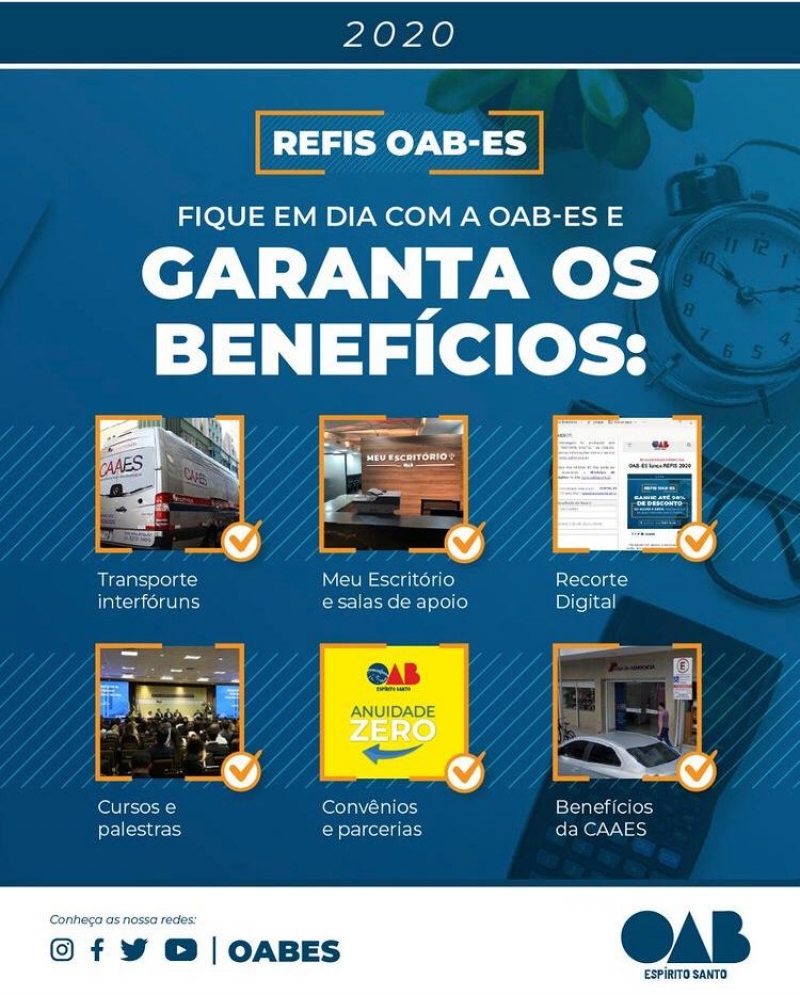 O Programa de Regularização Financeira (REFIS) da Ordem dos Advogados do Brasil –Seccional Espírito Santo (OAB-ES) continua até o próximo dia 20 de dezembro de 2020.