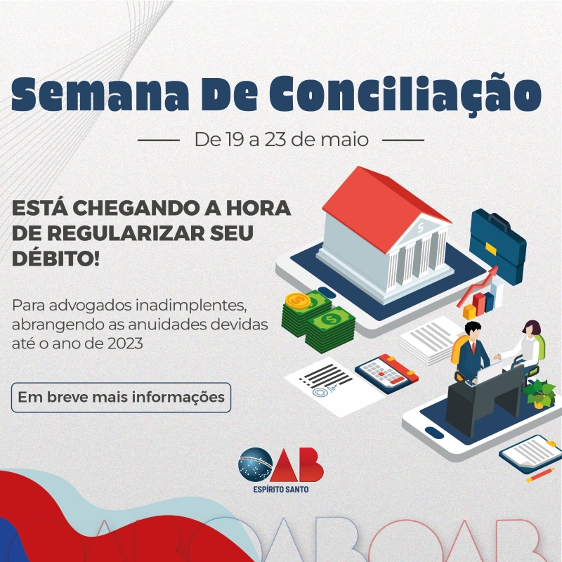 Entre os dias 19 e 23 de maio, a OAB-ES realizará a Semana de Conciliação, oferecendo condições especiais para que advogados e advogadas regularizem suas anuidades junto à Seccional. A iniciativa reforça o compromisso da atual gestão em apoiar a advocacia capixaba, especialmente diante dos impactos financeiros enfrentados durante e após a pandemia.