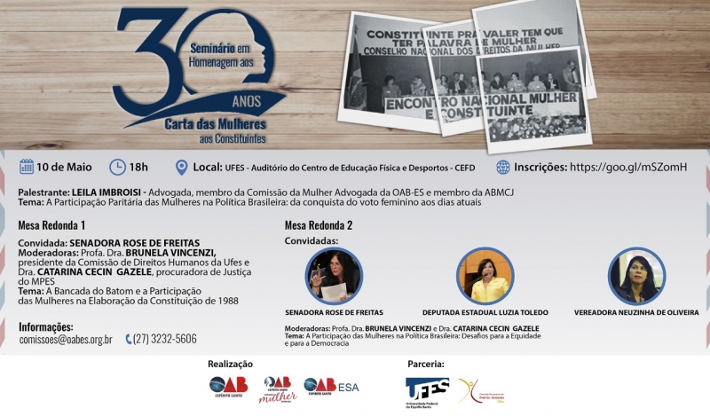 Por motivo de força maior, o seminário em homenagem aos 30 Anos da Carta das Mulheres aos Constituintes. que seria realizado na próxima quinta-feira (26), foi adiado para o dia 10 de maio, também uma quinta-feira. O evento é promovido pela Comissão da Mulher Advogada da Ordem dos Advogados do Brasil - Seção Espírito Santo (OAB-ES), em parceria com a Universidade Federal do Espírito Santo (UFES), e acontece no Auditório do Centro de Educação Física e Desportos (CEFD), no Campus de Goiabeiras (UFES), a partir das 18h.