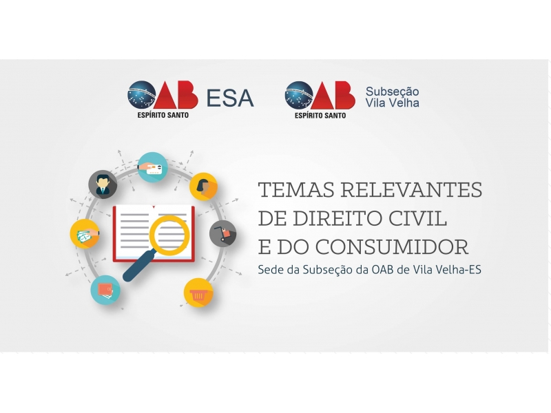 Temas relevantes de direito civil e do consumidor. Este é o seminário que será realizado na próxima semana, dias 27 e 28, na Subseção de Vila Velha. As inscrições estão abertas e devem ser feitas na sede da Subseção, localizada na Praça Almirante Tamandaré, Prainha. O seminário será das 19 às 22 horas, em ambos os dias.