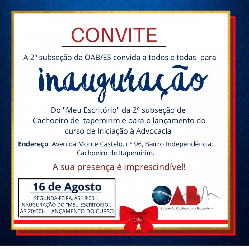 Também na segunda-feira, às 20 horas, a 2ª Subseção irá lançar o curso “Iniciação à Jovem Advocacia”, destinado a advogados e advogadas recém-formados e universitários no 9º ou 10º período do curso de Direito. Somente a aula inaugural, com a presença do presidente da Comissão da Jovem Advocacia, Baltazar Moreira Bittencourt, será presencial. Depois, o restante do curso será todo de forma on-line. A inscrição pode ser feita pelo link disponível no Instagram da 2ª Subseção de Cachoeiro de Itapemirim.