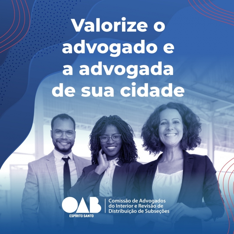 A Comissão de Advogados do Interior e Revisão de Distribuição de Subseções, através do presidente, Erich Augusto Filgueira Florindo, e do vice-presidente, Francisco Caliman, acaba de lançar a campanha “Valorize o advogado e a advogada de sua cidade”, cujo objetivo é fazer uma conscientização em favor da advocacia do interior, assim como já foi feito na Capital, falando da importância de se procurar um advogado do próprio município quando necessário.