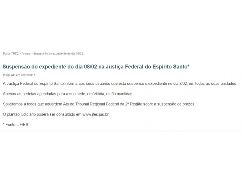 A Justiça Federal do Espírito Santo informa aos seus usuários que está suspenso o expediente no dia 8/02, em todas as suas unidades.