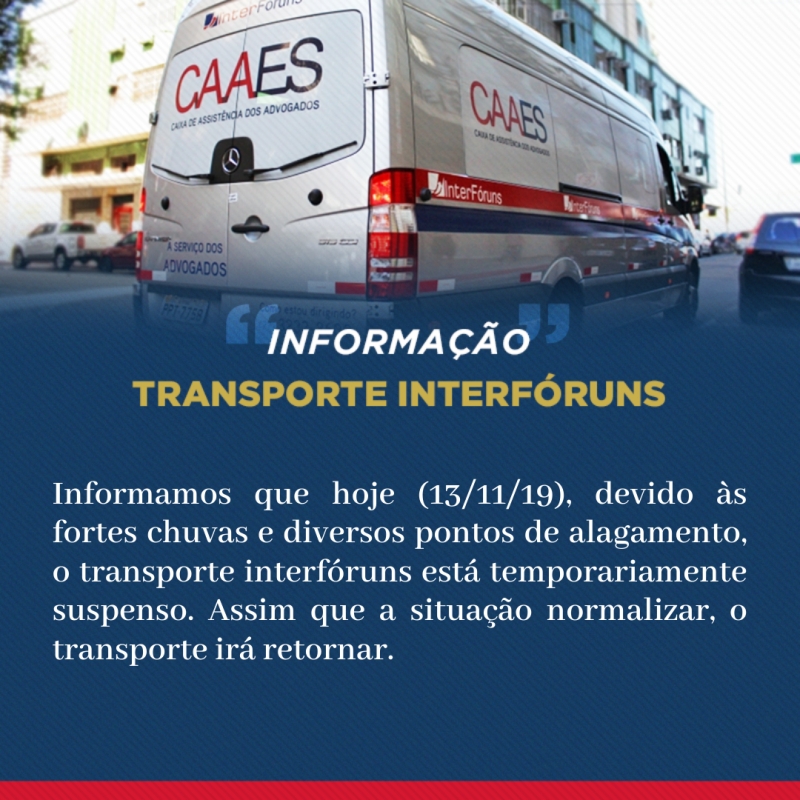 Informamos que nesta quinta-feira (14/11/19), devido às fortes chuvas e diversos pontos de alagamento, o transporte interfóruns continua suspenso. Assim que a situação normalizar, o transporte irá retornar.
