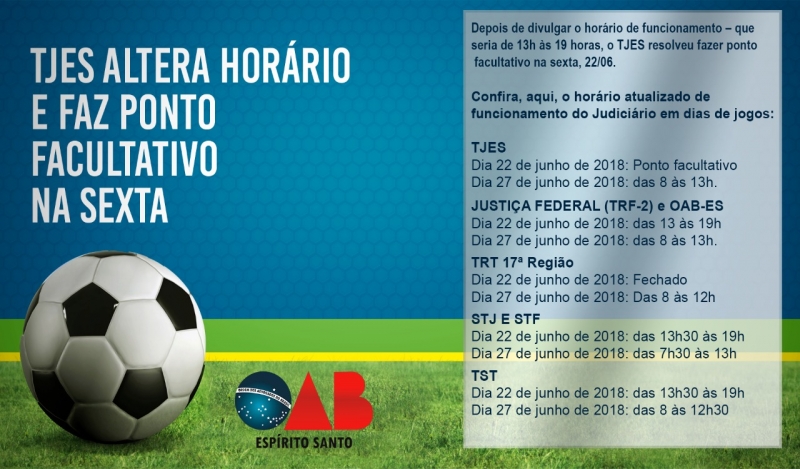 A Justiça Federal, o Tribunal Regional do Trabalho da 17ª Região (TRT), o Tribunal Superior do Trabalho (TST), Supremo Tribunal Federal (STF) e o Superior Tribunal de Justiça (STJ) divulgaram como será o funcionamento nos dias de jogos do Brasil na chamada Fase de Grupos da Copa do Mundo da Rússia de 2018. A Ordem dos Advogados do Brasil – Seção Espírito Santo (OAB-ES) também tem definidos seus horários de funcionamento nesses dias.