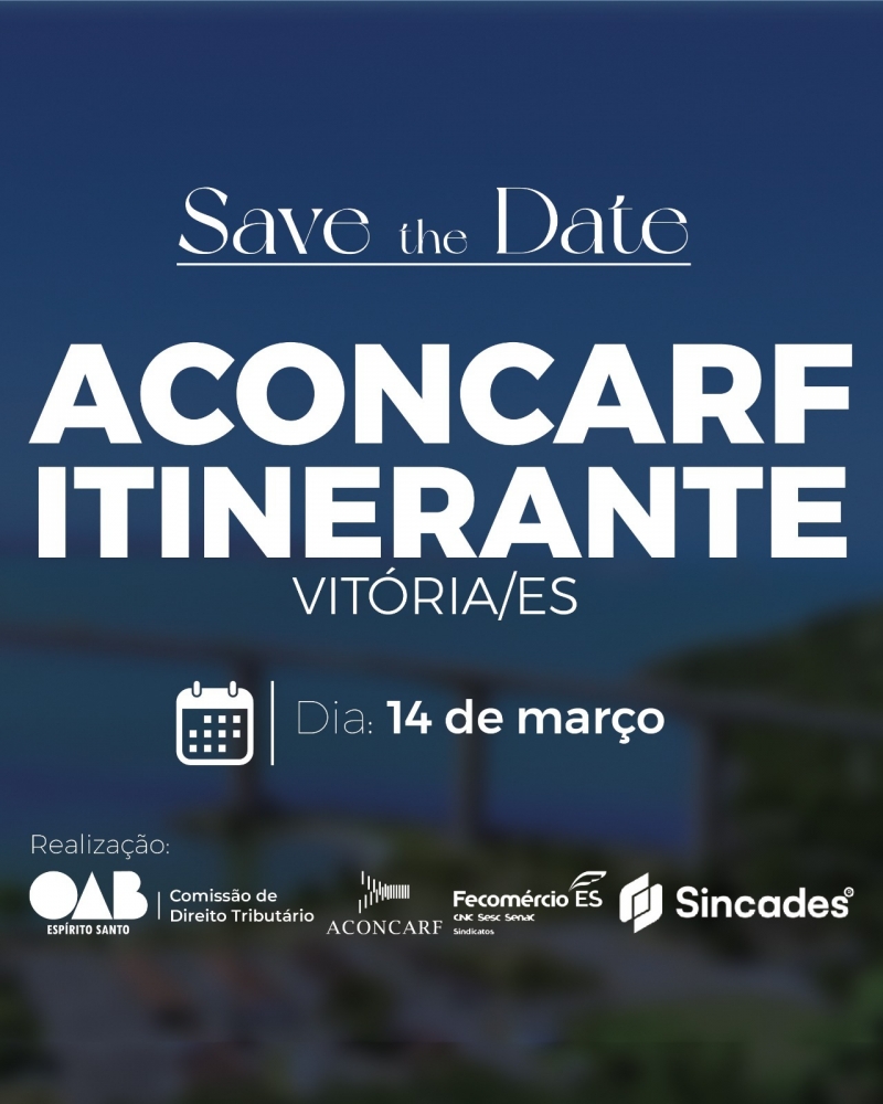 A ACONCARF, em parceria com a OAB-ES, Fecomércio-ES e Sincades, convida você para a edição do II ACONCARF Itinerante em Vitória. O evento é uma grande oportunidade para debater temas importantes sobre tributação e o funcionamento do CARF (Conselho Administrativo de Recursos Fiscais).