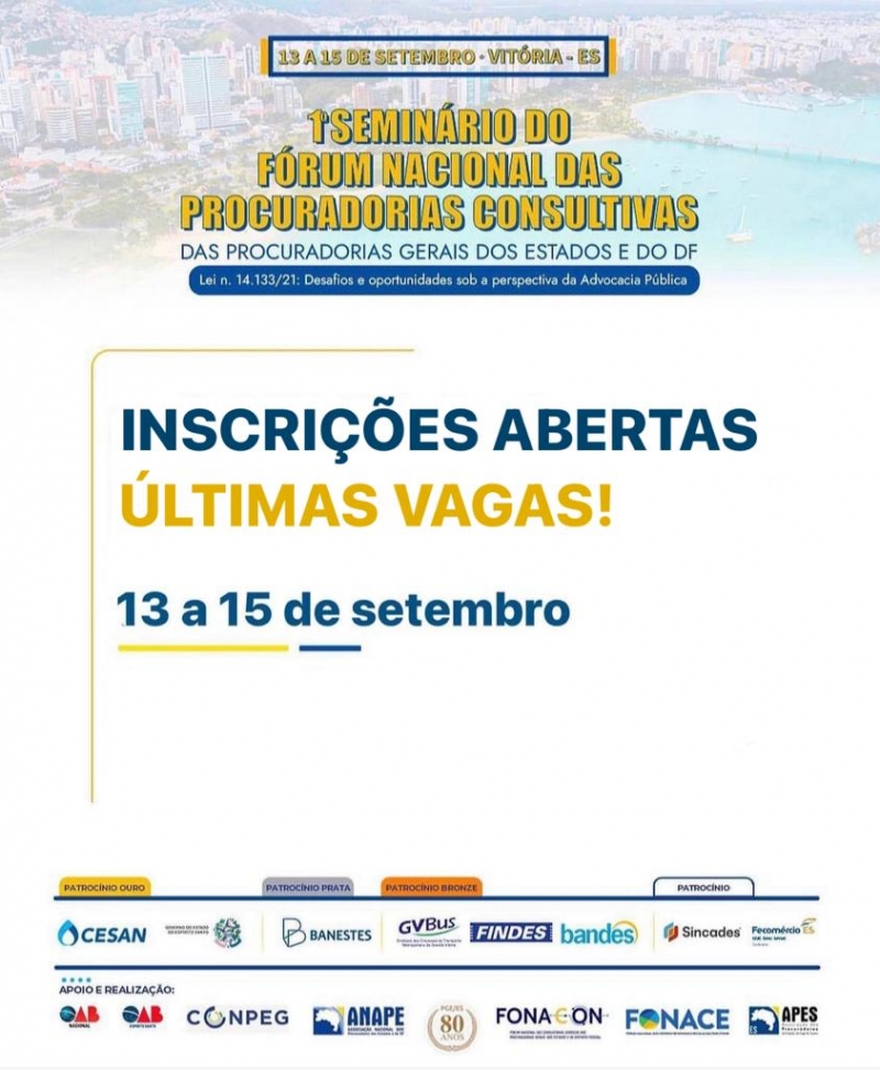 O seminário conta com patrocínio do Governo do Estado do Espírito Santo, Cesan, Banestes, Findes, GVBus, Bandes, Sincades e Fecomércio, além de apoio e realização da APES, ANAPE, CONPEG, FONACE, FONACON, OAB-ES e OAB Nacional.