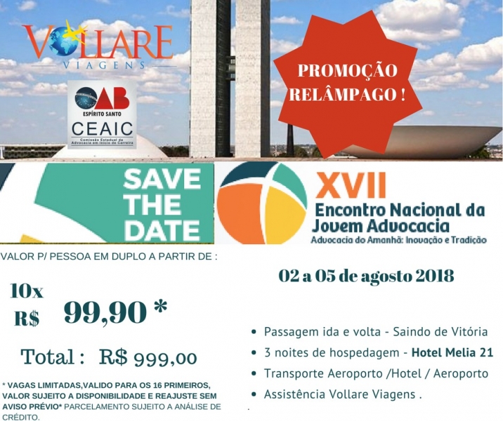 Jovens advogados que querem trocar experiências com colegas de todo o País não podem perder o XVII Encontro Nacional da Jovem Advocacia, que acontece entre 2 e 5 de agosto próximo em Brasília. As inscrições já estão abertas e para dar um incentivo a mais, a Comissão Estadual da Advocacia em Início de Carreira (CEAIC) está com uma promoção.